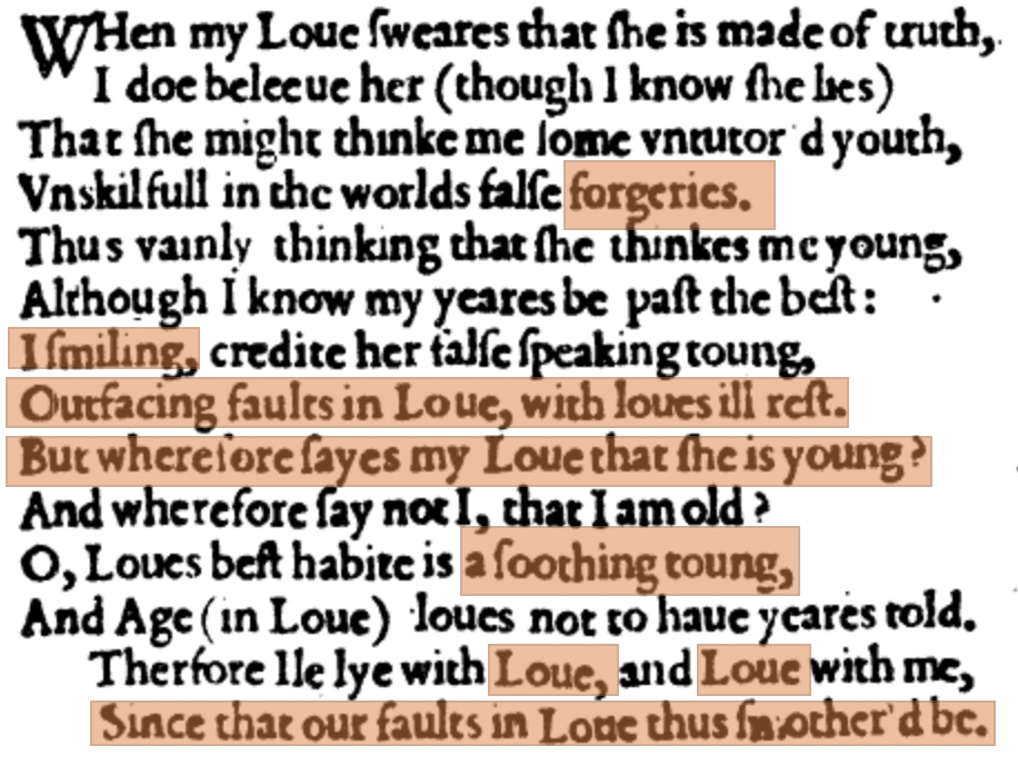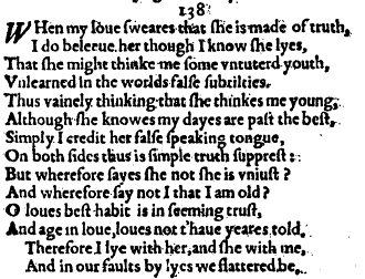 And then – problems upon problems! – I have to decide what the poems themselves say. Most of the sonnets written by Shakespeare only seem to survive extant in Eld’s printed version, but of course in the case of sonnets 138 and 144 we have some variations to consider: