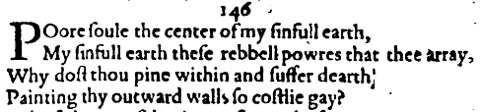 Riffle to sonnet 146 in your copy of Shakespeare’s Sonnets – or The Sonnets and a Lover’s Complaint, or The Complete Sonnets and Poems, or whatever it is you have in front of you. What has your editor chosen to write at the start of Line 2? Hunt around for their explanation – it may be in the small print at the bottom of the page; it may be in the notes at the end of the book; it may be in a ‘Note on the Text’ at the end of the introduction; it might not, perhaps, even be discussed anywhere in the book at all. Editors will normally feel duty-bound to put something here – but it’s worth reflecting that the words committed to print at this point in your edition may never actually have been Shakespeare’s.