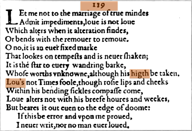 I’ve highlighted a couple of features that would now be fairly uncontroversially chalked up to a compositor’s hurry: sitting between sonnets 115 and 117, it would appear the ‘6’ was turned upside down in the process of its being set; ‘Lou’ in line 9 is normally taken to be a truncated ‘Loue’ (i.e. ‘Love’); in line 8, ‘higth’ is either an unusual or mistaken spelling of ‘highth’ or ‘heighth’ – seemingly archaic in Shakespeare’s time – or our more familiar ‘height’ (they all mean the same, in any case). But, broadly speaking, there’s nothing here in the localised presentation of the poem that suggests the activities of Eld’s compositors have affected the ongoing discussion which was framed by the Daily Mail in characteristically nuanced, thoughtful tones: Was Shakespeare Gay?